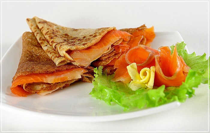 1) Блины с лососем и сливочным сыром ( 350 руб)